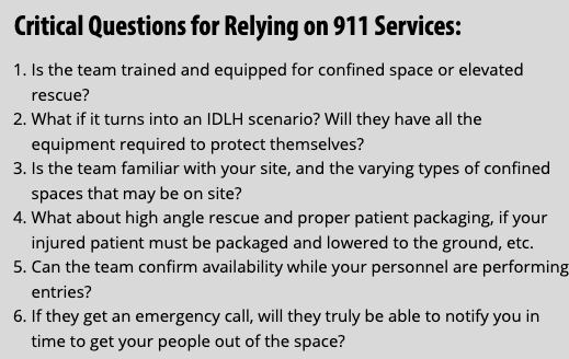 This applies whether you use an in-house rescue team, a contracted rescue service, or a local off-site response team. If an incident occurs and the rescue personnel you are depending on are not capable of safely performing a rescue, your company could be culpable.