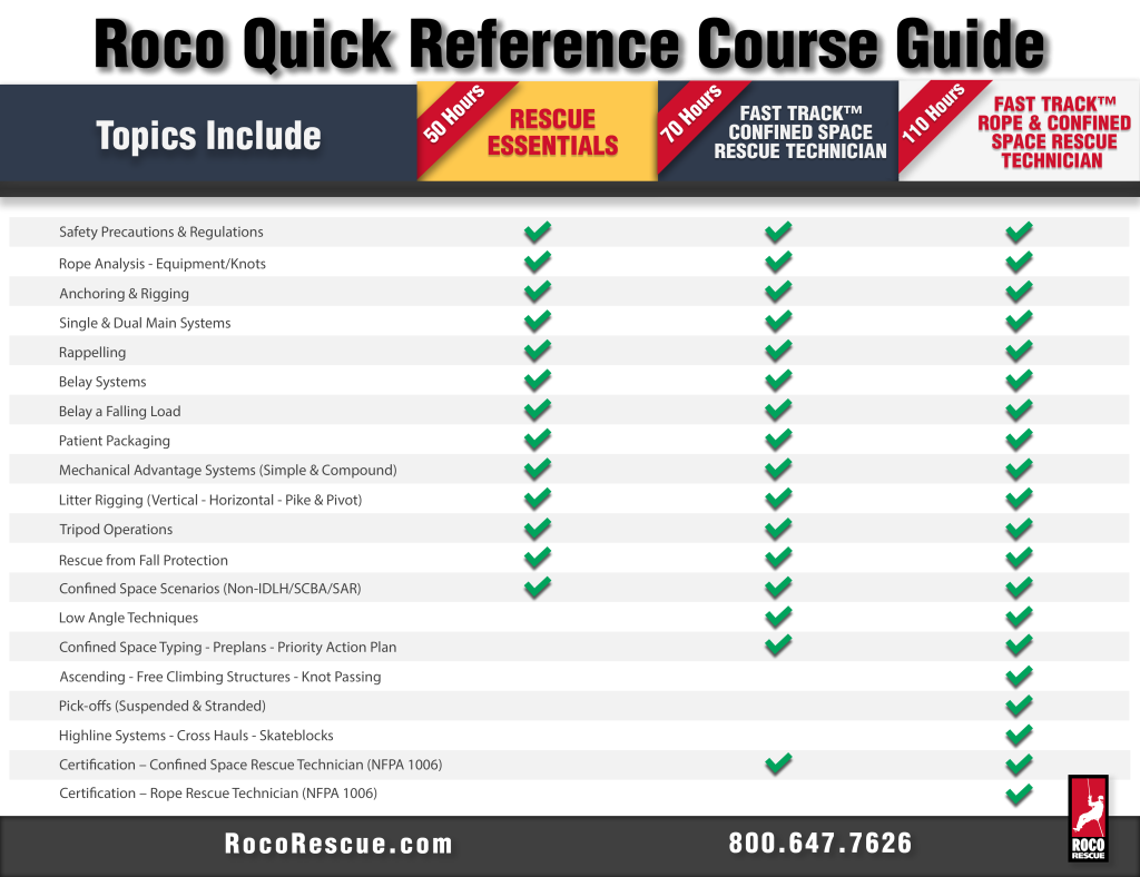 The majority of our customers begin with Confined Space Rescue Technician certification, which includes the skills to perform confined space and high angle rope rescue operations. They later complete the Rope Rescue Technician certification, which incorporates additional skills such as rope ascension (climbing); knot-passing; and high-line systems, to name a few. Refer to Roco’s Comparison Checklist below.
